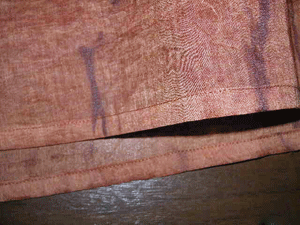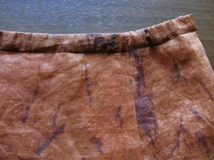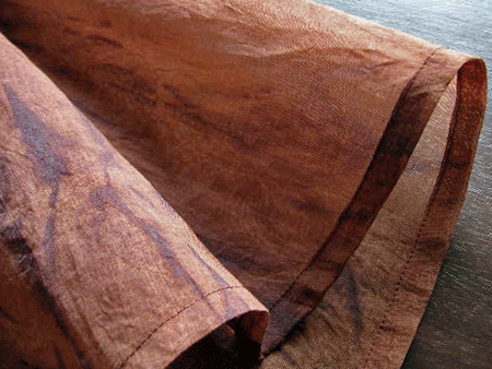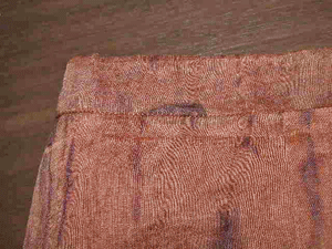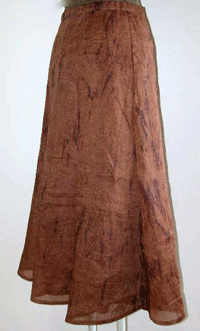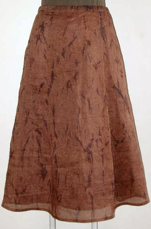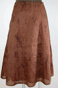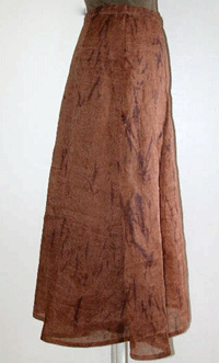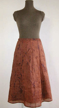 柿渋染めの綿オーガンジーの布でスカートを仕立てました。柿渋の手染めの布の何とも言えない素敵な自然の色合いが味わい深いスカートに仕上がりました。薄い布ですが張りが有り透明感の有る布なので、シンプルなソフトプリーツスカートに仕上げました。希少な布の素材感をお楽しみ下さいませ。