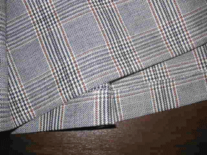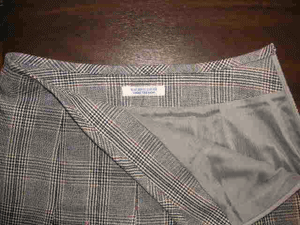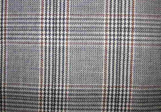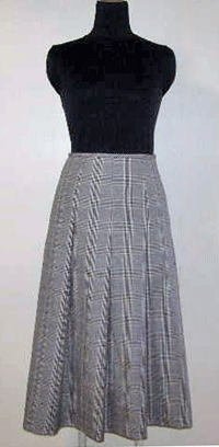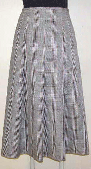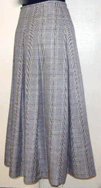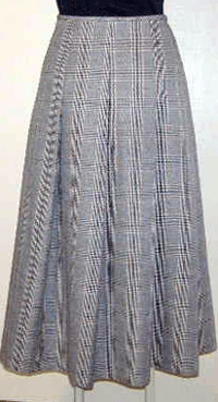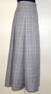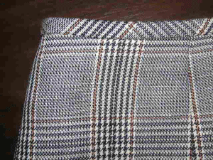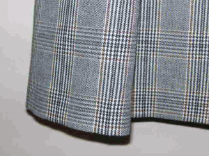 :マニッシュなグレンチェックの布は、綿の中でも暖かみの有る風合いの布です。グレーの濃淡と白のチェックにキャメル色とネービーブルーの糸を織り込んだ素敵な布で丈の長いソフトプリーツスカートを作りました。中肉の布なので、いろいろな季節に活躍しそなスカートです。