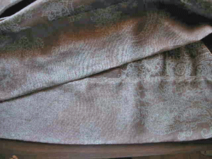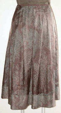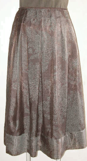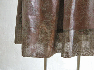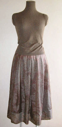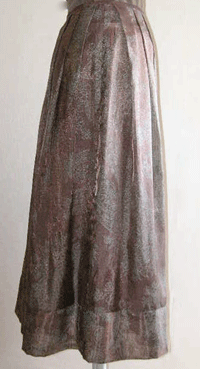 :ダークブラウンのsilk糸とライトブラウンのフィラメント糸のシャンブレーに繊細なダークグリーンのペーズリー柄か美しい Italy製の布でタックSkirtを仕立てました。裾の部分は切り替えをして二重仕立てに仕立てました。繊細で美しい布の表情を活かしたスカートに仕上がりました。ソシアルな場面にも日常のお洒落着にもご利用頂けるSkirtです。