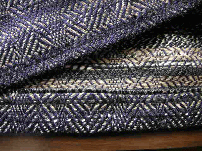 ウール/コットン/シルクの糸を使用したザックリした雰囲気が素敵です。濃紺に黒、ベージュ、白、のそれぞれ違う表情の糸使いが布表情に奥行をもたせています。中肉の厚みの布ですが、とても落ち感のある布の為、ドレープが奇麗です。味わいの有るジャガードの質感をお楽しみ下さいませ。