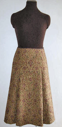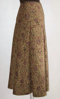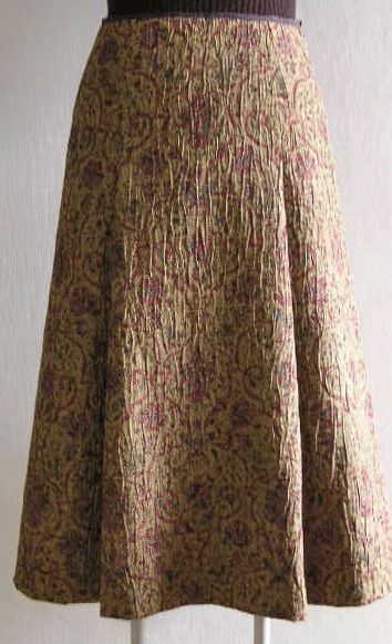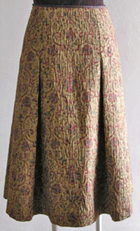 :以前タックスカートとラップスカートのご提案をさせていただきました布を、今回は裾広がりのシルエットのソフトプリーツSkirtに仕立てました。裾のフレアーが優雅な高級感のあるスカートに仕上がりました。キュプラの裏布付きで着心地もしなやかです。ふくれジャガードにプリントを施した、とても深みの有るそして複雑な表面感の布のSkirtは希少で魅力的です。焦げ茶のタイツやブーツがとても良く似合います。アンティークな雰囲気の素敵な布をお楽しみ下しませ。