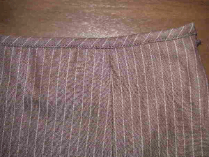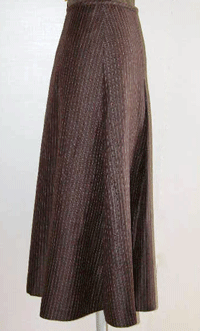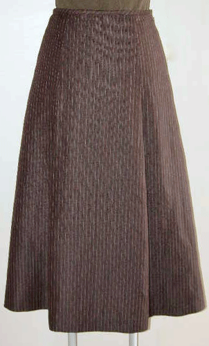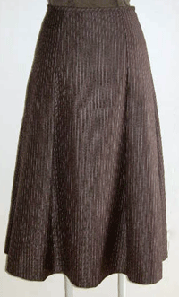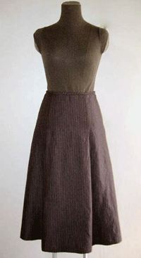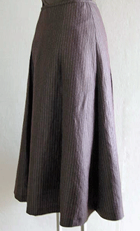 クラシックで素敵なウール麻の布でソフトプリーツスカートを仕立てました。シックでとても味わいの有る魅力的な布です。縦糸が焦げ茶色のウール、横糸にダークベージュの麻、ストライプはライトベージュです。ウール麻の独特な風合いをお楽しみ下さい。