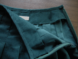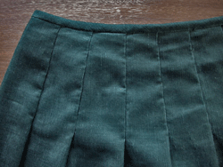 :前後とも左向き1方向の7本のタックが入っていて、途中まで中縫いをしていますのでウエスト周りはスッキリしています。