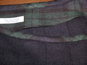:ウエストのバイアス布と見返しは、Black Watch柄のリネンの布を使用しました。ウエスト部分がすっきりし、柄もアクセントになっています。