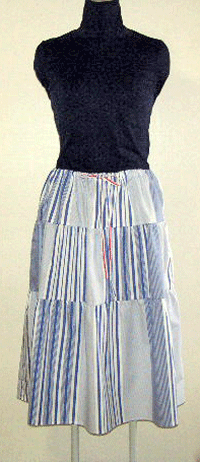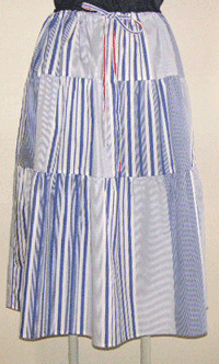 段切り替えのティアードスカートは、切り替えのバランスとランダムストライプの柄の出方にこだわりました。