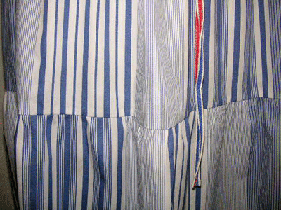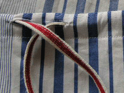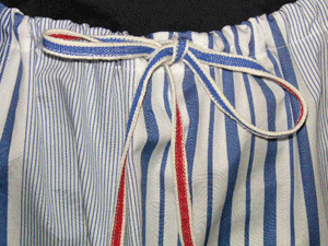 :ウエストはベルトレスで細い見返しにソフトなゴムテープと、トリコロールの麻混テープを通してギャザーを寄せています。