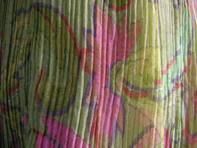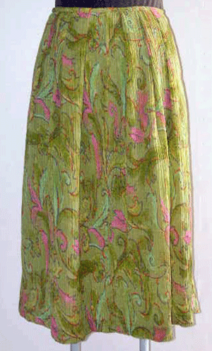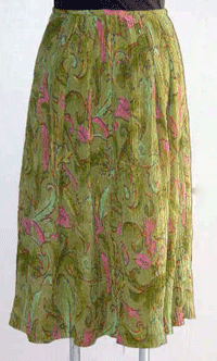 : シルク麻の楊柳に若草色と桜色のアラベスク模様をプリントしたとても繊細で美しい布のタックスカートです。