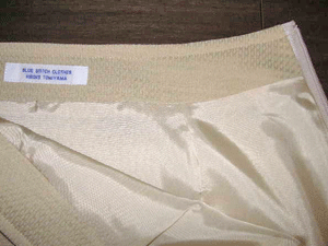 はちみつ色のドビー織りの布は横糸に細いコードのような糸を使用しているので適度に横に張りが有りソフトプリーツのラインがきれいに出ました。春から夏にいつも着たくなる色です。茶系や白い麻のシャツを合わせるととても良くに合います。この布はイタリー製の布でクラシックな雰囲気がとても素敵です。綿/レーヨンの素材なのでトロンとした落ち感がり、エレガントな仕上がりです。