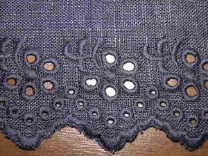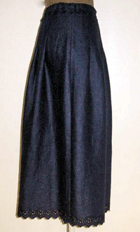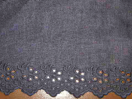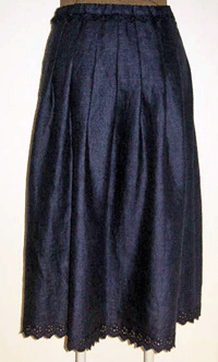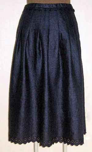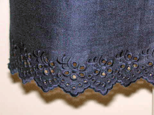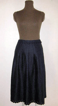 : ネービーのリネンにカットワーク刺繍が施された布は清楚で可憐な印象が大好きです。2種類のカットワークを裾とウエスト部分に使ったスカートです。リネンの自然で心地よい風合いとカットワーク刺繍の可憐な雰囲気をお楽しみ頂けるスカートです。