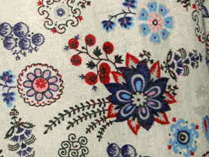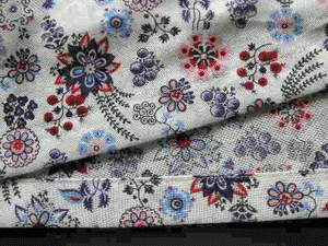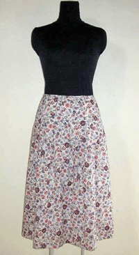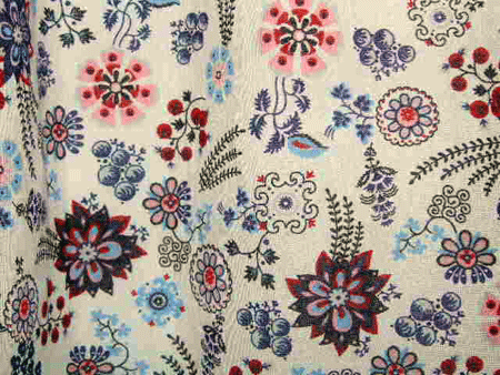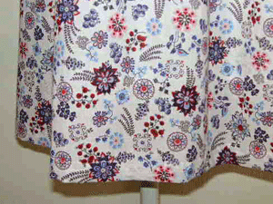 強撚のコットンにエスニックな花柄のプリンとを施した布はドイツ製の布です。きめの細かい弾力性の有る風合いと繊細な柄がとても魅力的に感じます。ボイルタイプの布ですので軽やかなタックスカートになりました。白の裏地(透け防止キュプラ)付き仕立てです