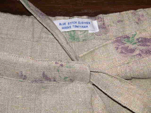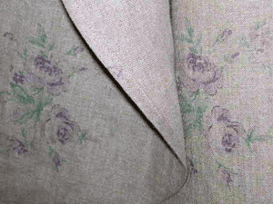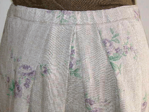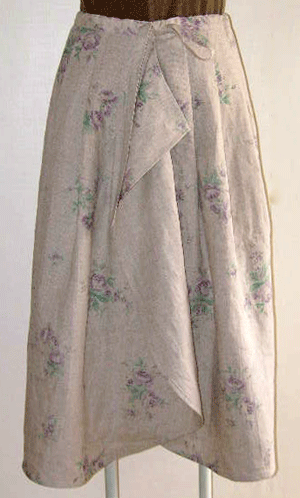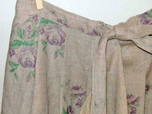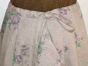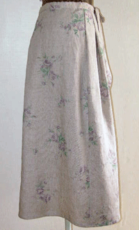 ナチュラルな生成りのリネンに淡いパープルのローズブーケのプリントを施した布でラップスカートを作りました。リネンの自然な色にブーケのアンティーク調なシックな色合いがとても素敵です。白や生成りに合わせナチュラルな雰囲気をお楽しみ下さい。