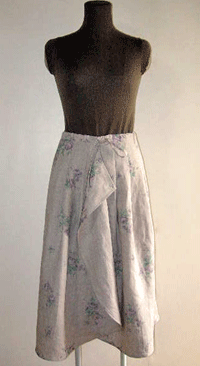 :通常のラップスカートは、上前がはだける事が気になる事が有りますが、この型は下前も中心よりにタックがあり布の分量感が有るので、気になりません。