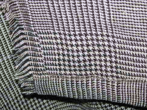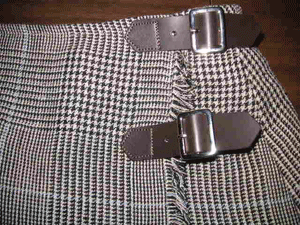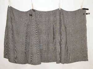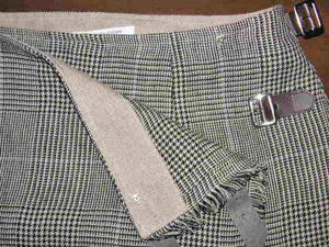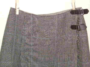 :マニッシュなグレンチェックのリネンはライトブルーのラインが素敵です。糸の質感と撚り織りの組織によってシッカリしているけれど柔らかみの有る落ち感のあるシワも美しい布でItaly製です。ダークブラウンのレザーのタブがよく似合います。秋色リネンのラップスカートです。