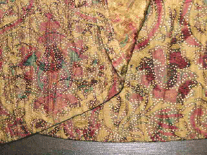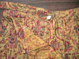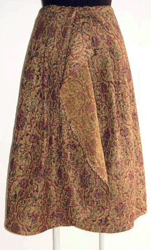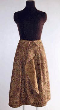goldの細かいドット状のプリントが重厚感と美しさを添えています。この布は1987年頃のイタリア製の布で、私のOld collectionです。布の美しさをお楽しみ頂けるラップスカートに仕上げました。