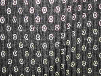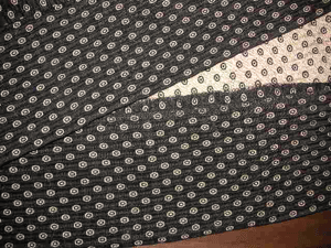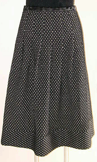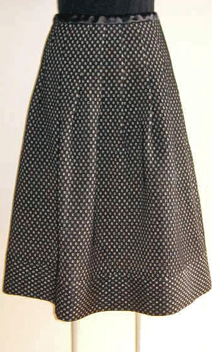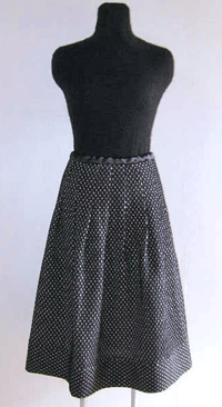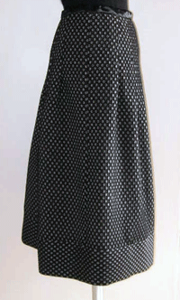 :モノトーンのシックな小紋柄 二重織りのジャガードでタックスカートを作りました。シルクのマットな楊柳の表情とフワッとしたタックがとても良く似合っています。ウエスト布にはシルクサテンを合わせ、素材感と織りが上品な高級感のあるスカートに仕上がりました。
