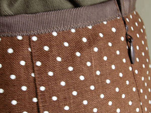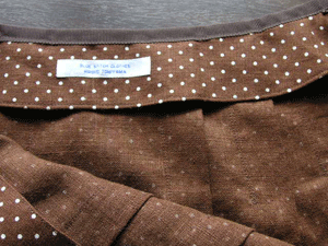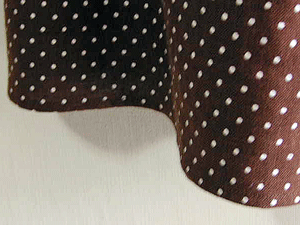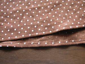 :しなやかな風合いの上質なリネンにクラシックな雰囲気のブラウンにオフホワイトのピンドットを施した布です。