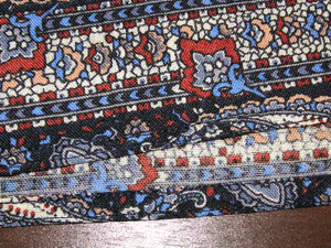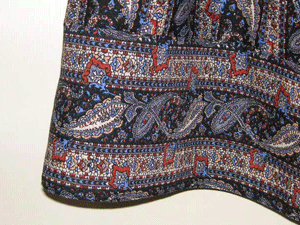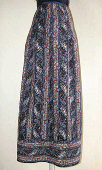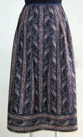 :ウールモスリンのペーズリープリントです。イタリア製のクラシックな柄ですので、上品でとても素敵な布です。左の画像は、ほぼ実物大の大きさです。実物の方が深みの有る色合いです。全体のイメージは上のスカートの色合いをご参考になってくださいませ。モスリンは強撚の平織りのウール地で私の大好きな布の一つです。クラシックな雰囲気が魅力です。学生の頃、アンティークな花柄のワンピースを作って着ていた事を思い出します。ウールモスリンは、なんともノスタルジックな布です。